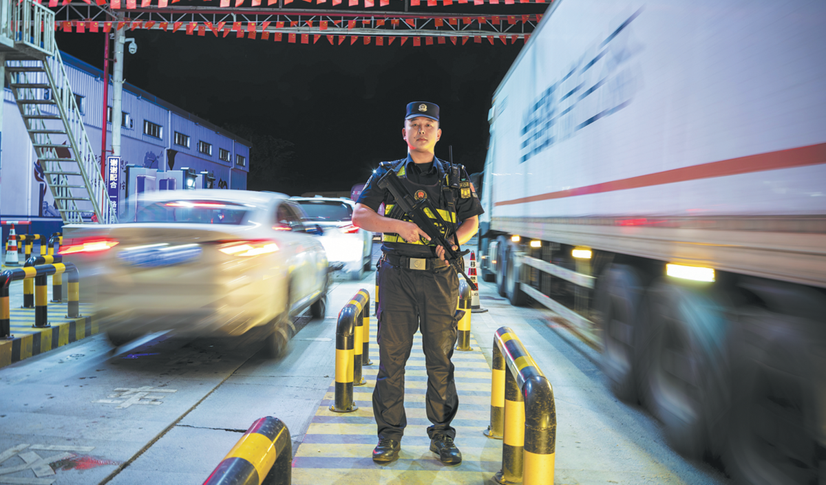 Въоръжен полицай на служба в граничната инспекционна станция Dakaihe в автономна префектура Xishuangbanna Dai, провинция Yunnan. [Photo provided to CHINA DAILY]