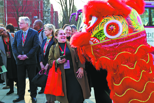 Чуждестранни дипломати общуват с изпълнители на лъвски танци по време на посещение в квартал Шуни, Пекин, в петък. [Photo provided to China Daily]