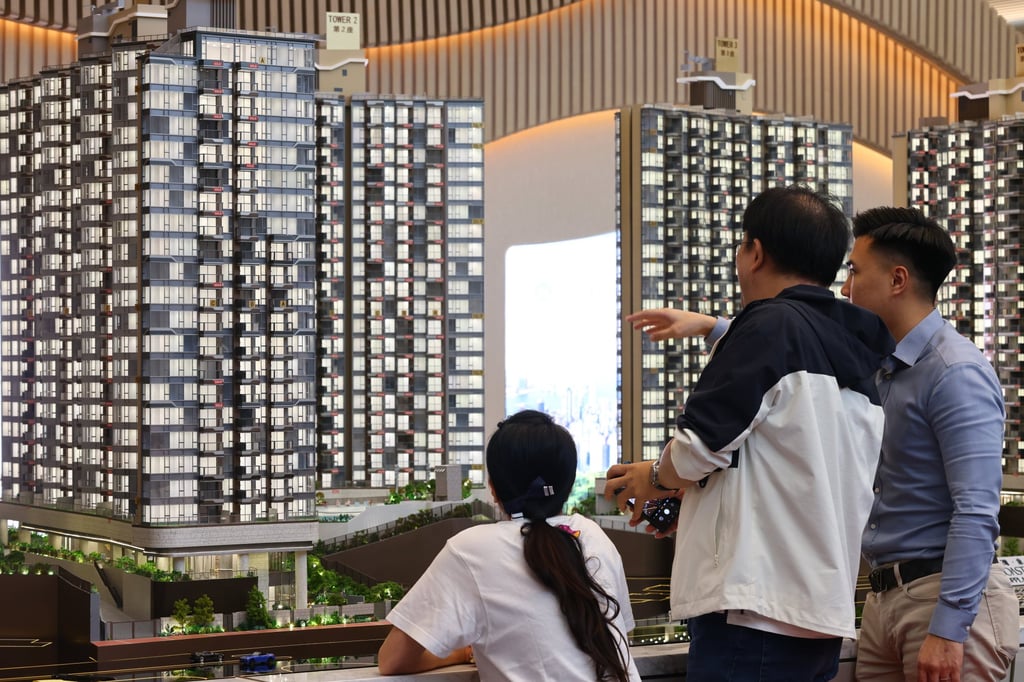 Купувачи на жилища в търговския офис на Early Light International Holdings разглеждат модел на The Reserve в жилищния комплекс Gold Coast Bay в Туен Мун на 15 ноември 2025 г. Снимка: Диксън ЛийКупувачи на жилища в търговския офис на Early Light International Holdings разглеждат модел на The Reserve в жилищния комплекс Gold Coast Bay в Туен Мун на 15 ноември 2025 г. Снимка: Диксън Лий