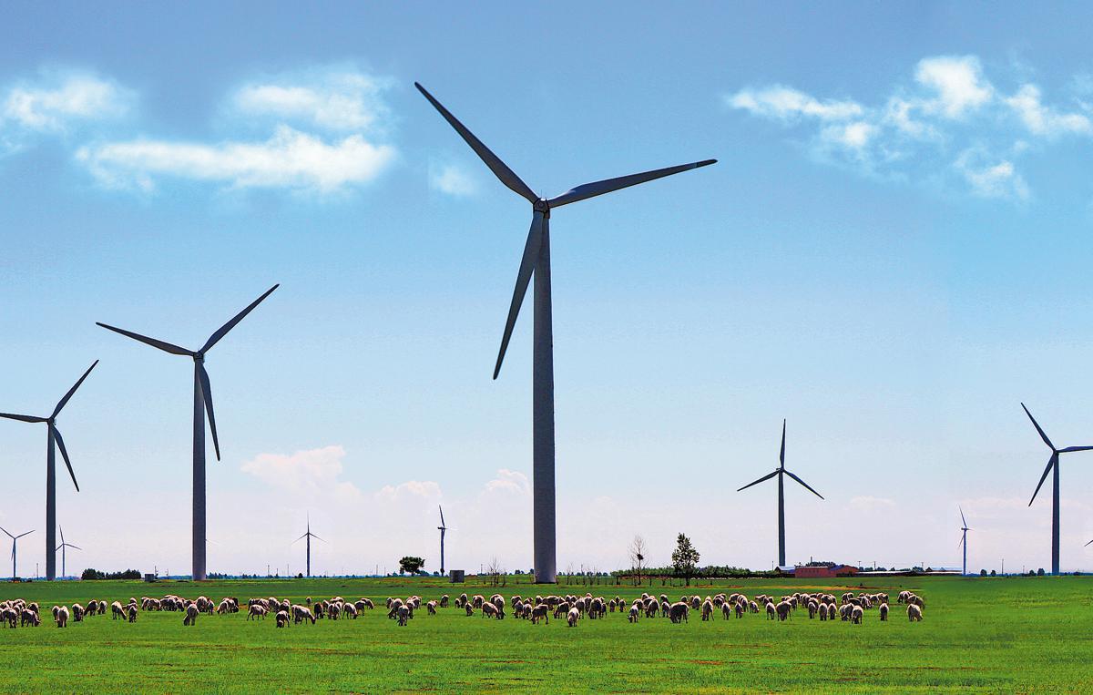 Вятърна ферма за пасища в района Taobei на Baicheng, провинция Jilin, през юли. LI XIAOMING/ЗА КИТАЙ ДЕЙЛИ