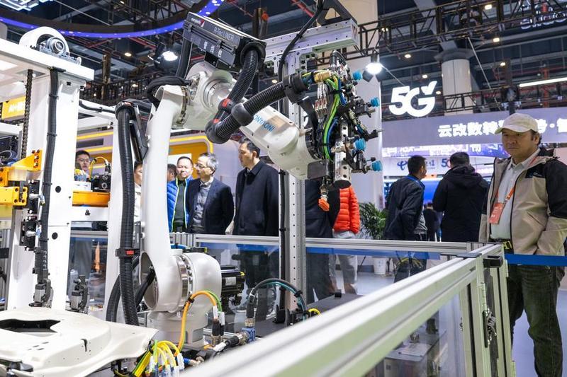 Посетители разглеждат работна станция за производство на автомобилни компоненти по време на 2025 China 5G + индустриална интернет конференция в Ухан, провинция Хубей в централен Китай, 21 ноември 2025 г. [Photo/Xinhua]