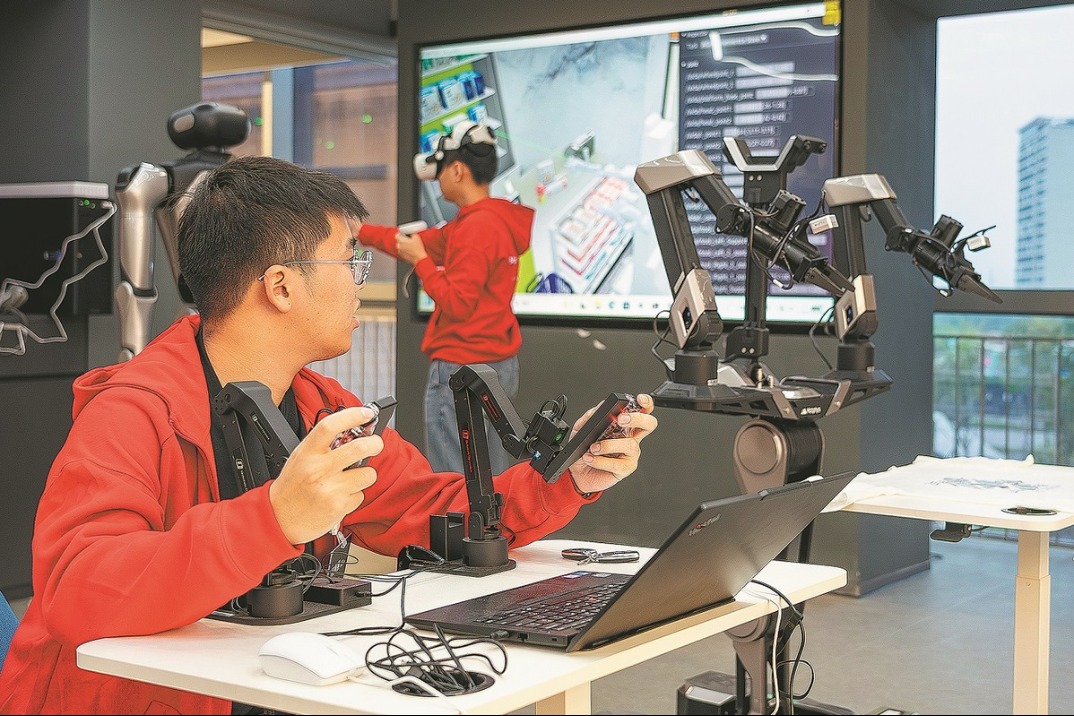 Служителите на Motphys“ в първата в Китай напълно независима тренировъчна база за симулация на роботи в Ухан, провинция Хубей, работят с роботи в различни симулационни сценарии, за да изпълняват конкретни задачи и да събират данни. [Photo provided to China Daily]