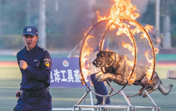 Кунминг от базата за полицейски кучета в Кунминг демонстрира умения в тренировка в Пекин през 2024 г. CAI YANG/XINHUA