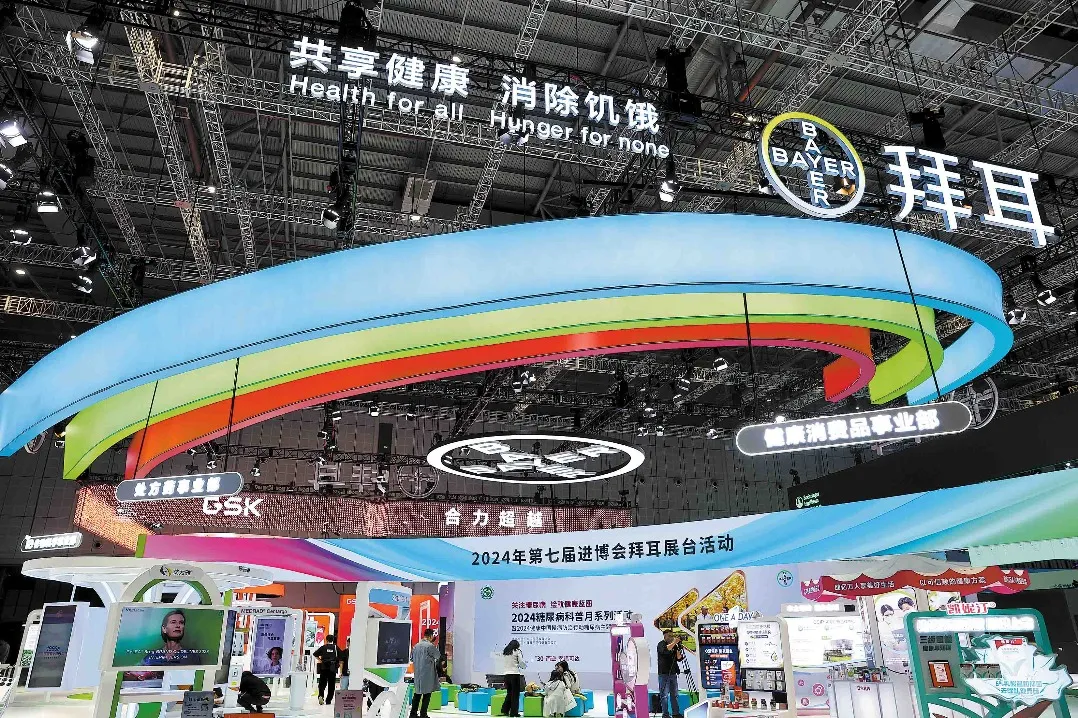 Посетители проверяват продуктите на изложбения щанд на германската компания за науки за живота Bayer по време на 7-то Китайско международно изложение за внос в Шанхай на 5 ноември 2024 г. CHINA DAILY