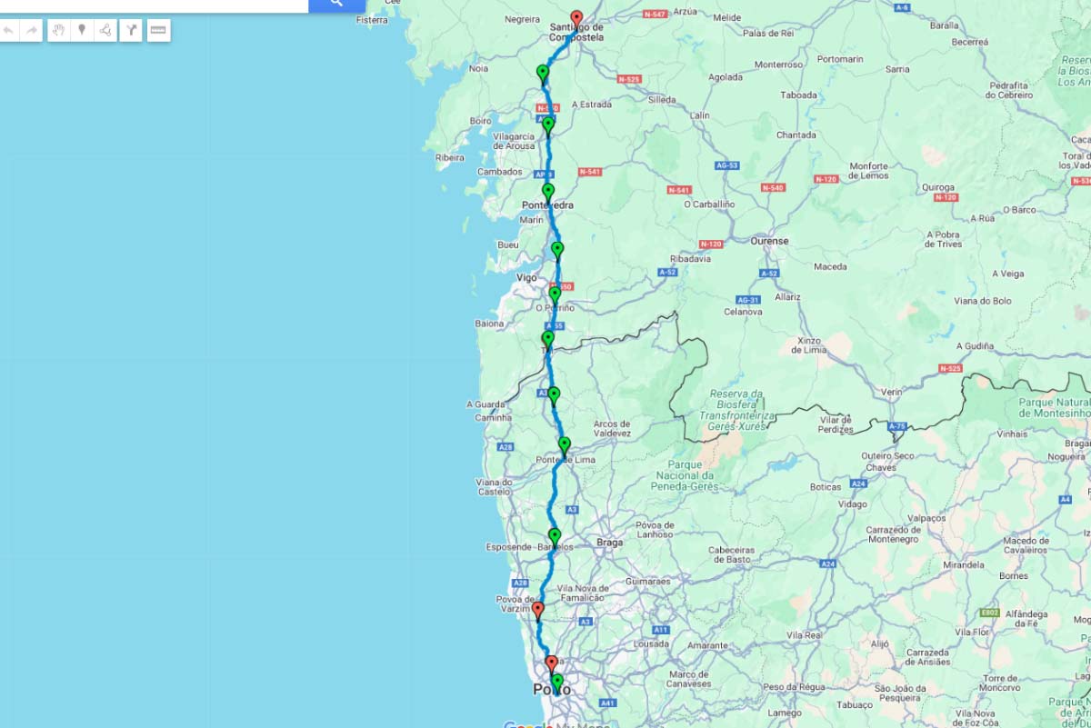 This is a Google Maps track of the Camino Portuguese Central Route and can be used on a mobile phone for navigation. We created this map following the yellow arrows with a GPS device. The link can only be opened while online (with wifi or data), but navigation on the track works even when offline. Zoom in and keep the blue dot on the trail.