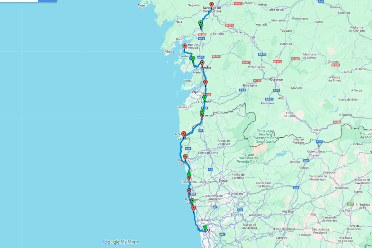 This is a Google Maps track of a Camino Portuguese route combining the Central route with the Spiritual Way. This Google maps trail can be used on a mobile phone for navigation. We created this map following the yellow arrows with a GPS device. The link can only be opened while online (with Wi-Fi or data), but navigation on the track works even when offline. Click on the map, make it full screen, zoom in and keep the blue dot on the trail.