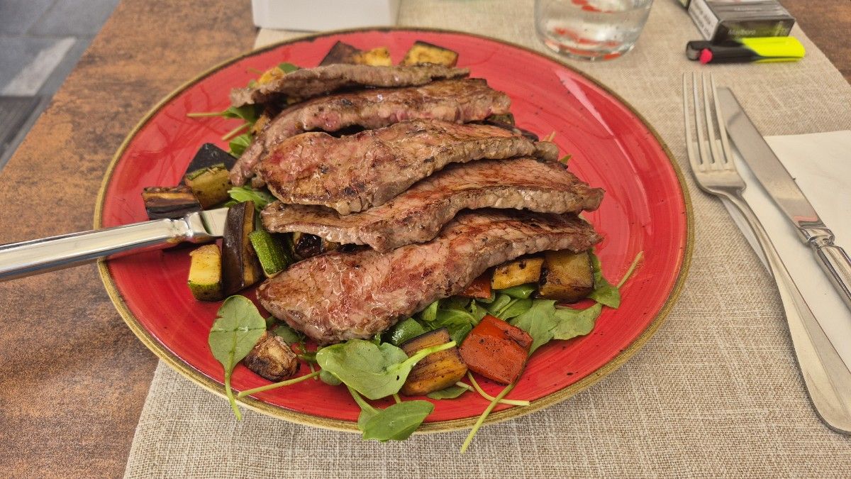 I asked the waiter what he would suggest, and in the end I decided on Roastbeef tagliata (30€) and mineral water (0.7l for 6.5€). Soon, food arrived. It was an enormous portion of meat (ok grilled) on grilled vegetables and salad. I somehow managed to clean the plate. I paid 40€ before leaving. Nice location, good service, great portions, and a bit pricey.